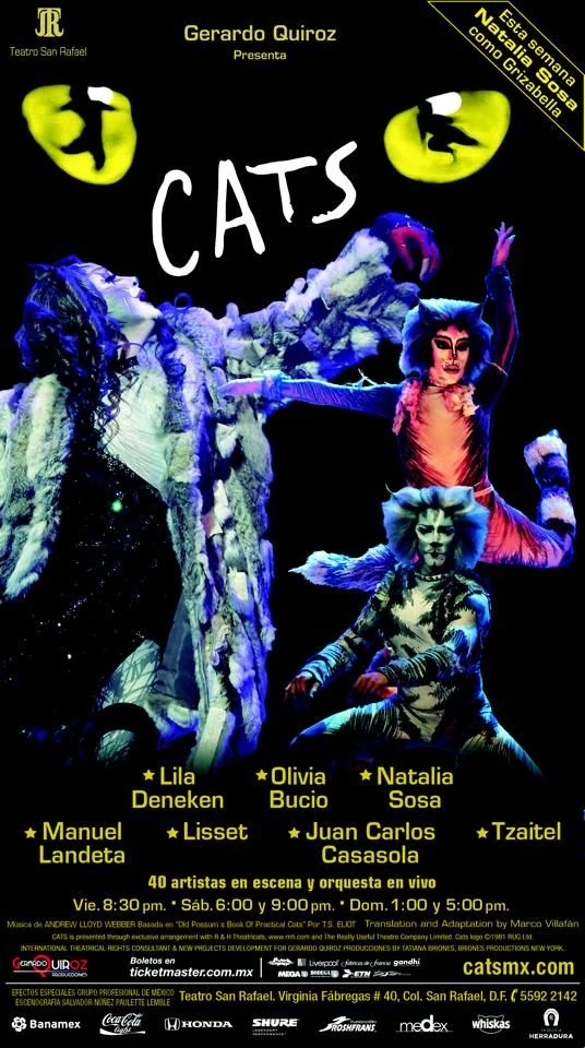 Cats opened at the San Rafael Theater (TEATRO SAN RAFAEL) on May 10, 2013, and closed on June 15, 2014. The production then played at the Cultural Center of Mexico City from July 19, 2014, to September 14, 2014, before touring the country and finally closing at the Cultural Center on December 30, 2014 (when the producer's license for the musical expired). It was seen by 500,000 people after more than 400 performances.